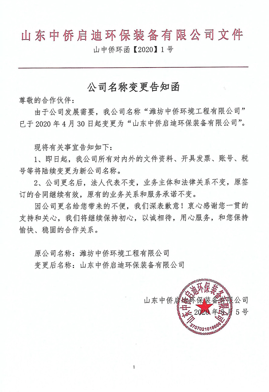 公告:一體化污水處理設(shè)備廠家濰坊中僑環(huán)境工程有限公司正式更名為山東中僑啟迪環(huán)保裝備有限公司