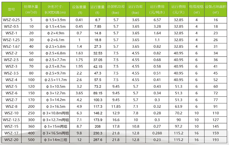 根據(jù)下面的表格和給出的參數(shù) 我們應(yīng)該選擇WSZ-1型號的QDPP一體化污水處理設(shè)備最為合適,這這個(gè)表格中我們可以詳細(xì)的看到選型設(shè)備的各種參數(shù),我們可以看到一體化污水處理設(shè)備的外形尺寸師直徑為2米,長度為4.9米的設(shè)備,占地面積為23平米, 根據(jù)這個(gè)尺寸我們可以確定 項(xiàng)目現(xiàn)場占地面積和需要多大的地方就可以安裝這個(gè)設(shè)備,后面的數(shù)據(jù)有重量,根據(jù)這個(gè)稱重量來做地基的土建建設(shè),還有運(yùn)行功率和后期的運(yùn)行費(fèi)用都可以一目了然。