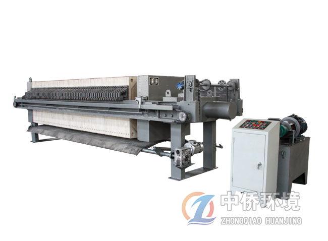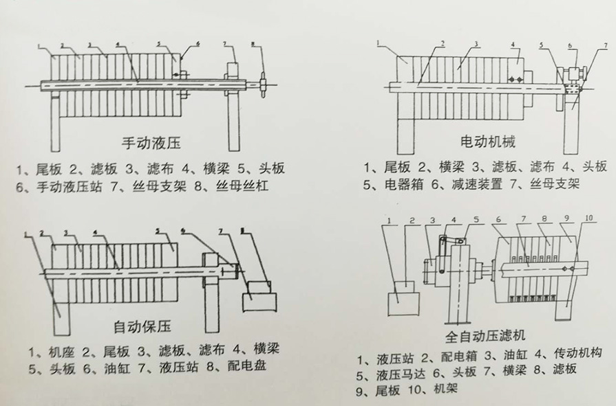 啟動(dòng)電機(jī),通過(guò)減速機(jī)帶動(dòng)絲桿轉(zhuǎn)動(dòng)推動(dòng)頭板移動(dòng),壓緊濾板,然后用鎖緊螺母鎖緊。用泵將帶過(guò)濾的懸浮液輸送至已壓緊的各個(gè)濾室中,懸浮液中的液體透過(guò)濾布,通過(guò)各濾板上的濾液孔排至機(jī)外,懸浮液中的固體顆粒積聚于濾室中,逐漸形成濾餅,濾餅充滿濾室,即完成一個(gè)過(guò)濾循環(huán)。如使用雙隔膜濾板,可在進(jìn)料結(jié)束后,向橡膠模內(nèi)通入壓縮空氣,使隔膜鼓脹,壓榨濾餅,使濾 餅內(nèi)水分進(jìn)一步溢出。