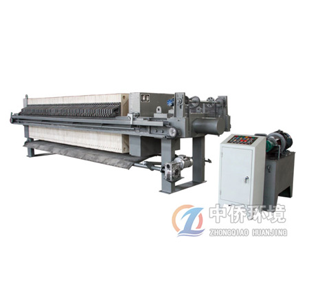 手動(dòng)搬動(dòng)絲杠手輪,使頭板前進(jìn),待濾板初步壓緊后改為液壓頂緊。用泵將帶過(guò)濾的懸浮液輸送到已壓緊的各個(gè)濾室中,懸浮液中的液體透過(guò)濾布,通過(guò)各濾板上的濾孔排至機(jī)外,懸浮液中固體顆粒則積聚于濾室中,并逐漸形成濾餅,濾餅充滿濾室即完成一個(gè)過(guò)濾循環(huán),過(guò)濾完成后則松開(kāi)濾板,拉板卸料。